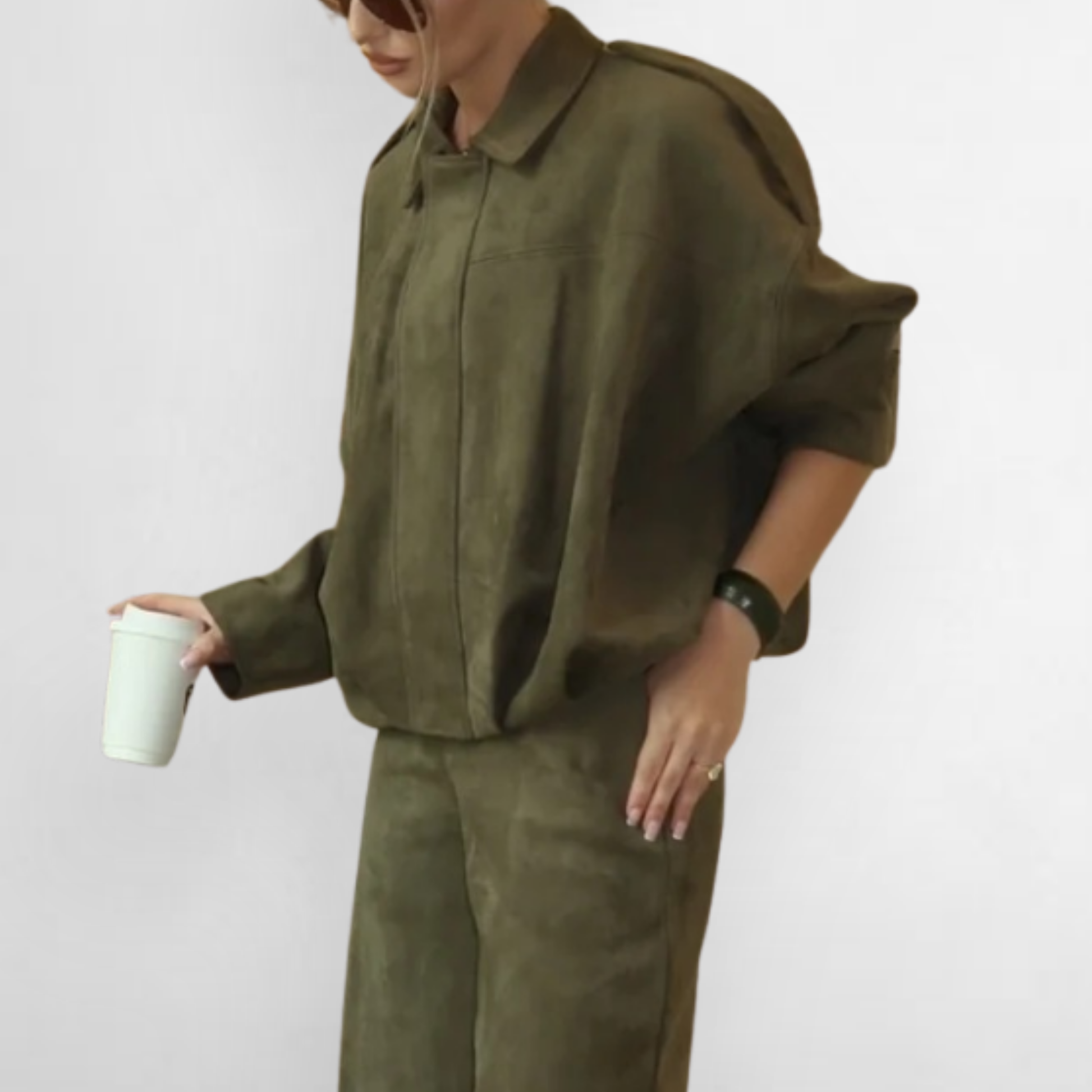 Design: A classic bomber jacket reimagined in rich green suede texture, featuring a sleek silhouette that blends sporty edge with refined style.