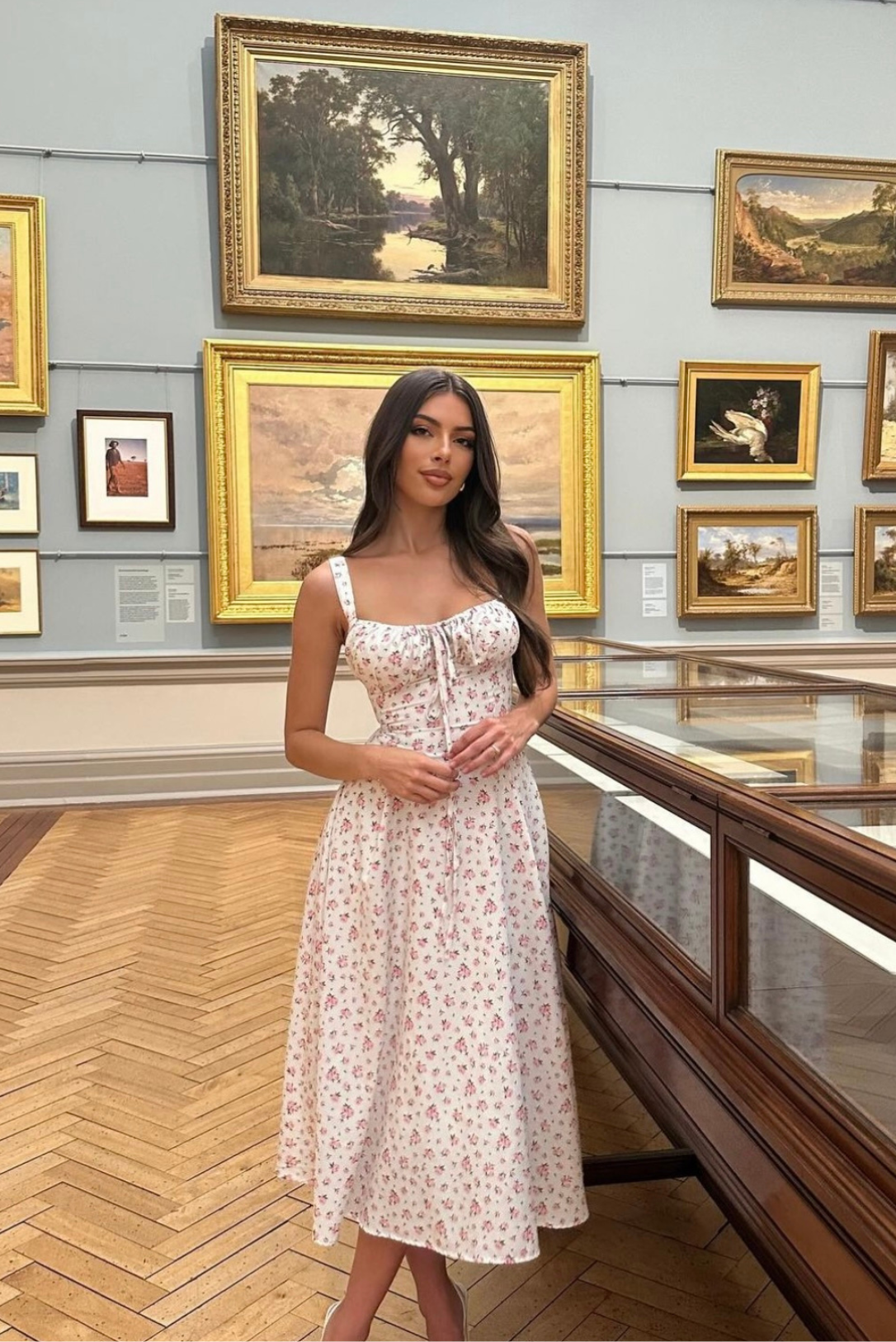 Poised and prettily restrained, the Gelsomina Midi Dress brings a soft countryside charm to quiet museum days or garden strolls. Its corset-style bodice and dainty floral motif create a silhouette that is as demure as it is deliberate.