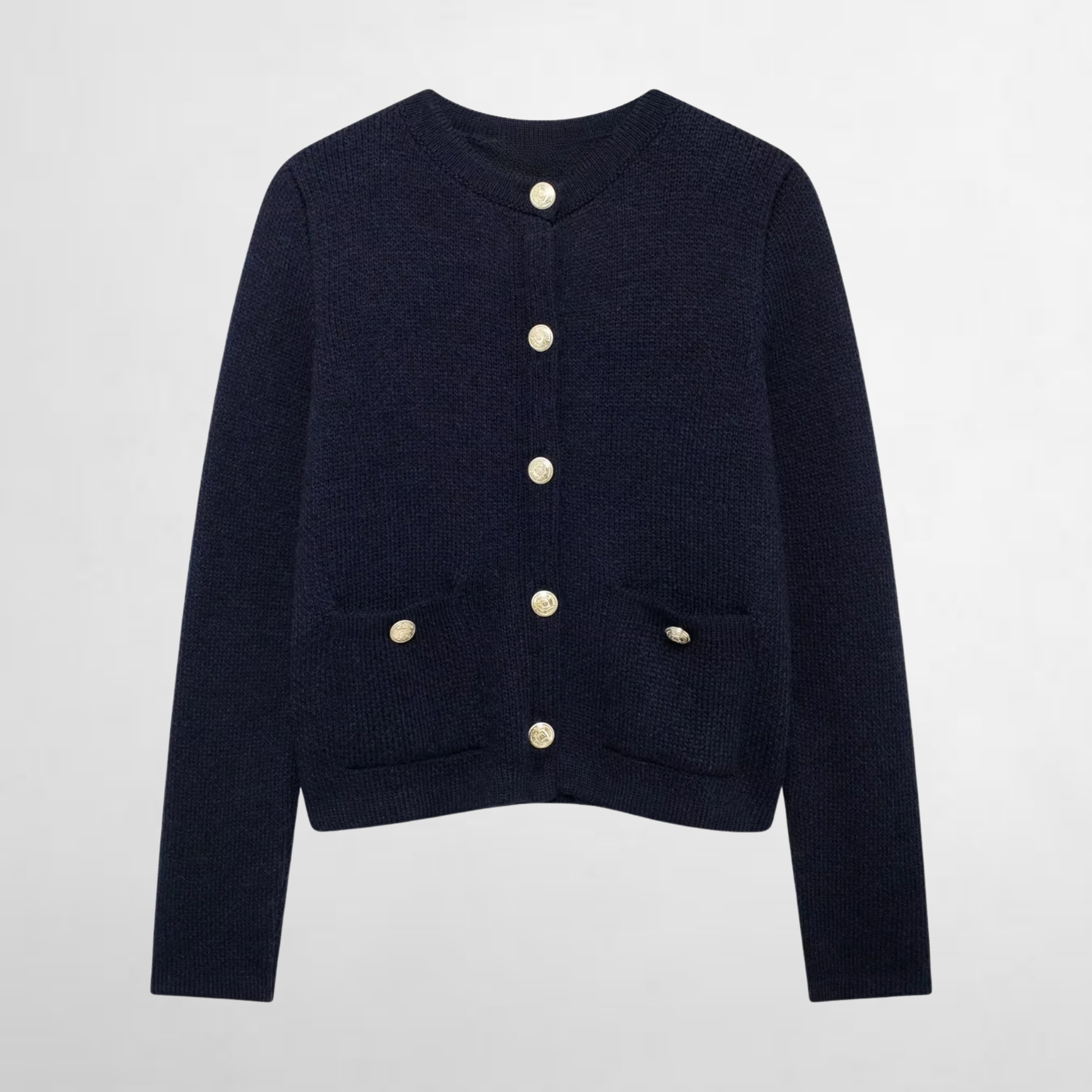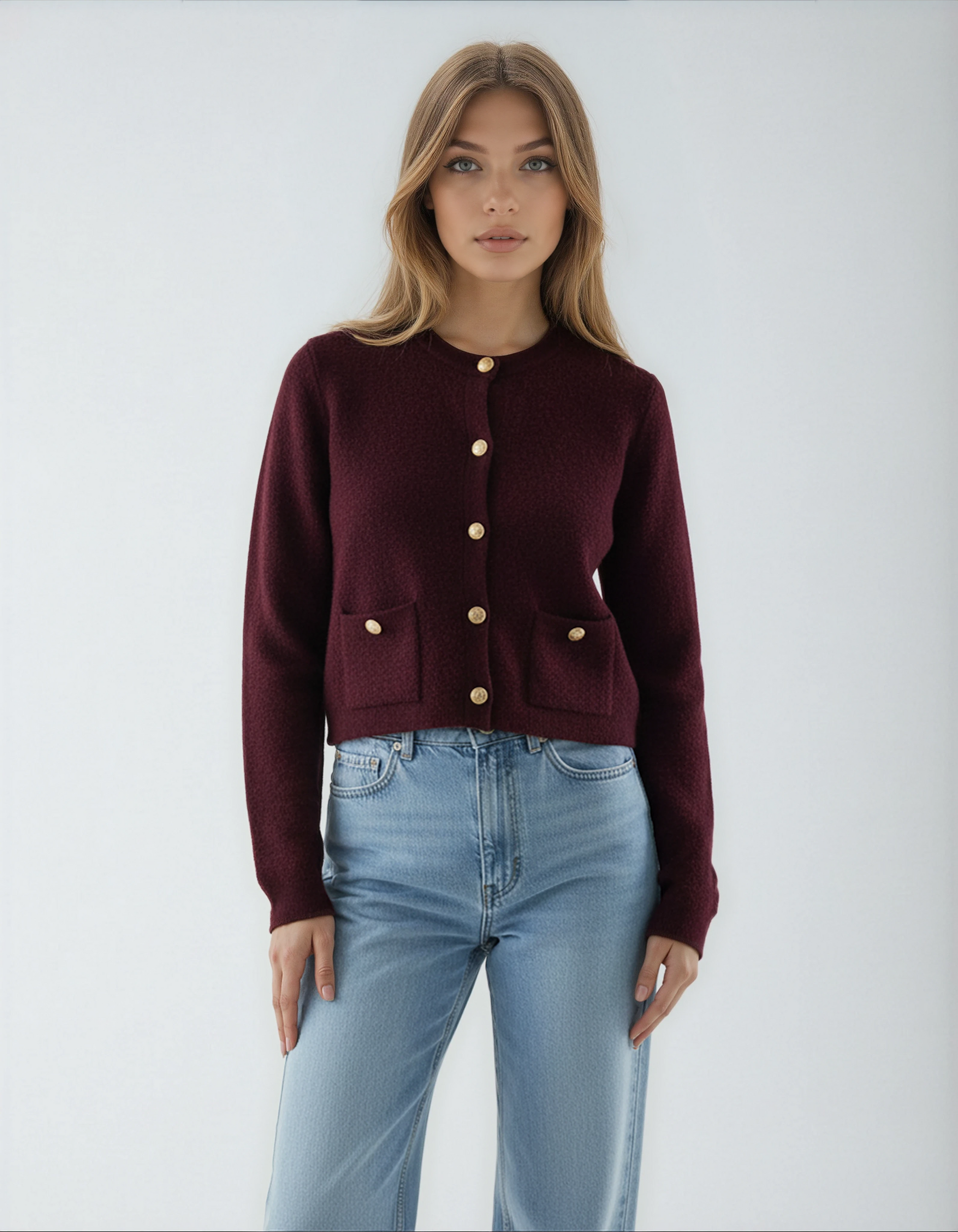 Design: Short knitted cardigan jacket with a row of gold decorative buttons, blending vintage charm with contemporary elegance.