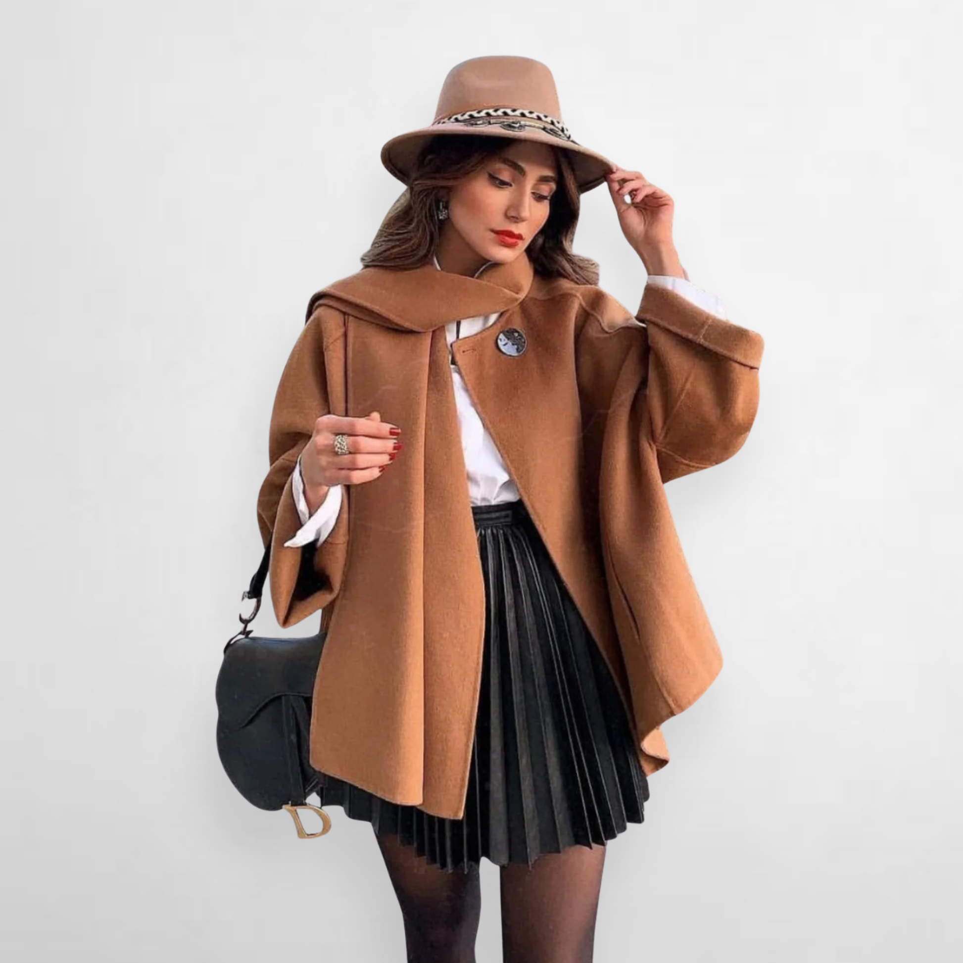 Design: A chic mini skirt featuring soft draped pleats for a flattering, feminine silhouette, making it the perfect piece for stylish winter layering.