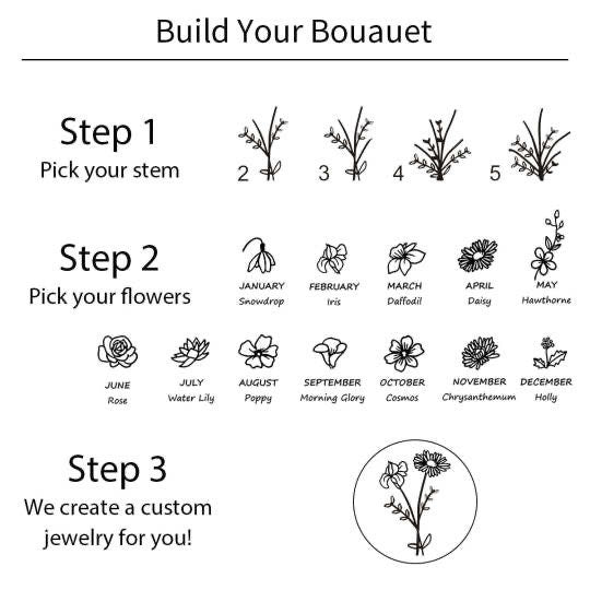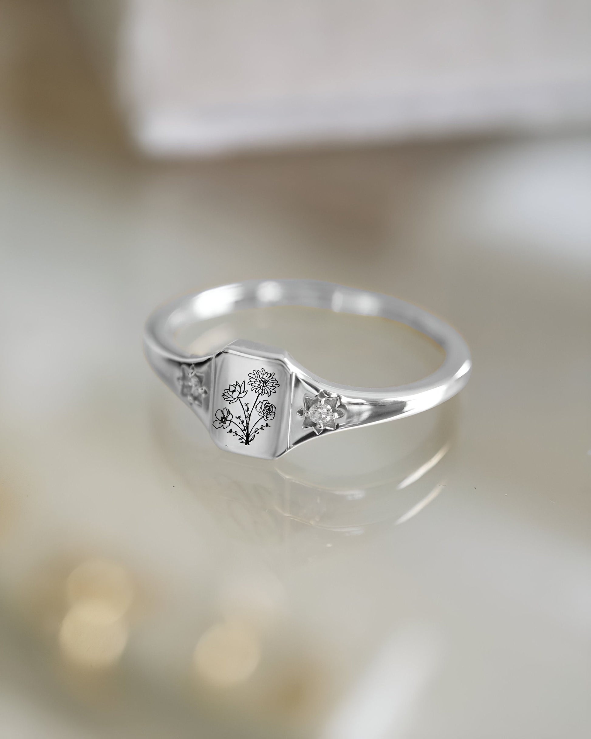 Our Customized birth flower ring makes the perfect trendy gift for your mother, sister, grandparent, bridesmaid, close friend, Each personalized premium quality ring can be personalized with 1-5 birthflowers. We offer 12 different kinds of birth flowers.