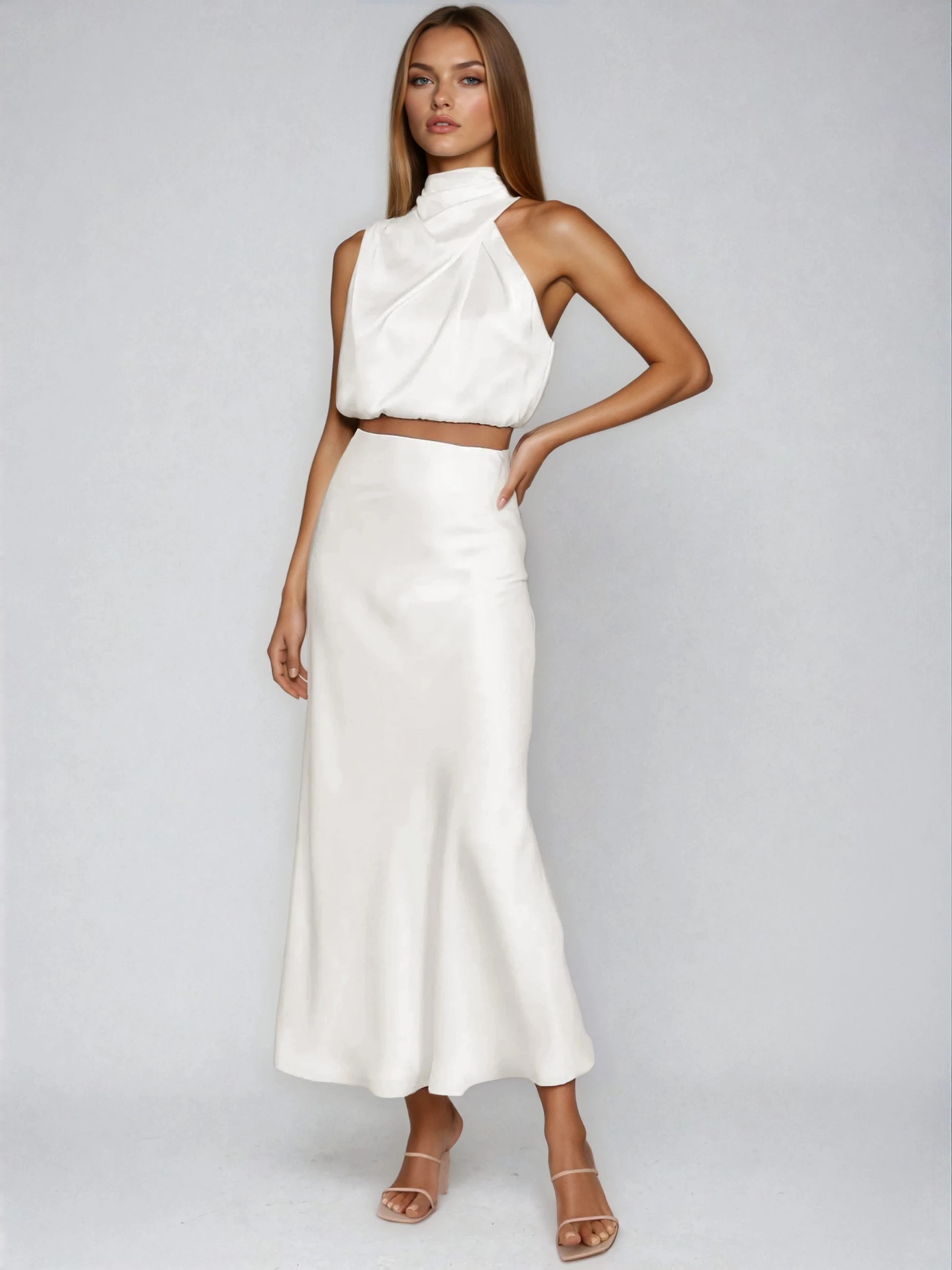Design: A chic two piece set featuring a halter neck top paired with a flowing skirt in elegant solid colors, blending simplicity with modern sophistication.