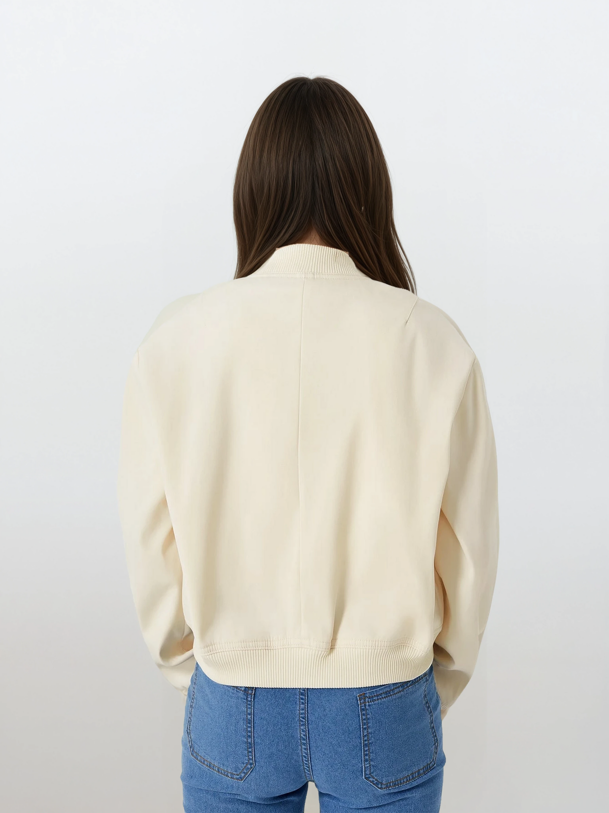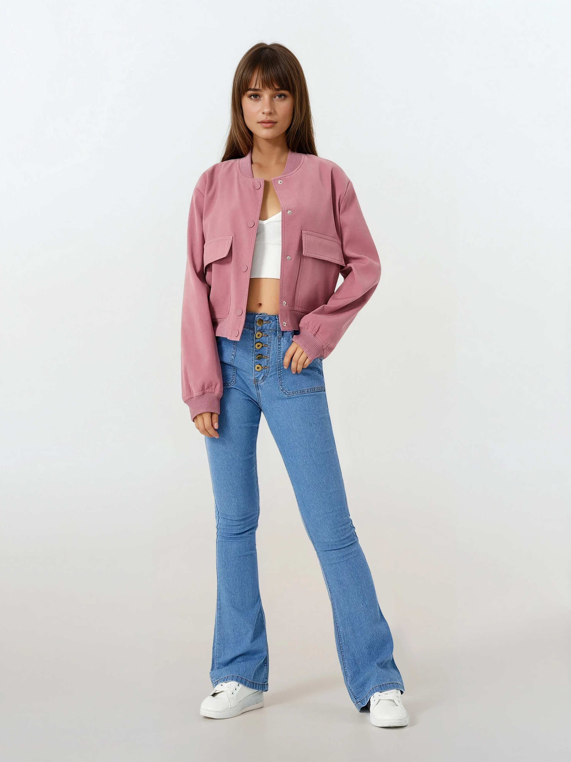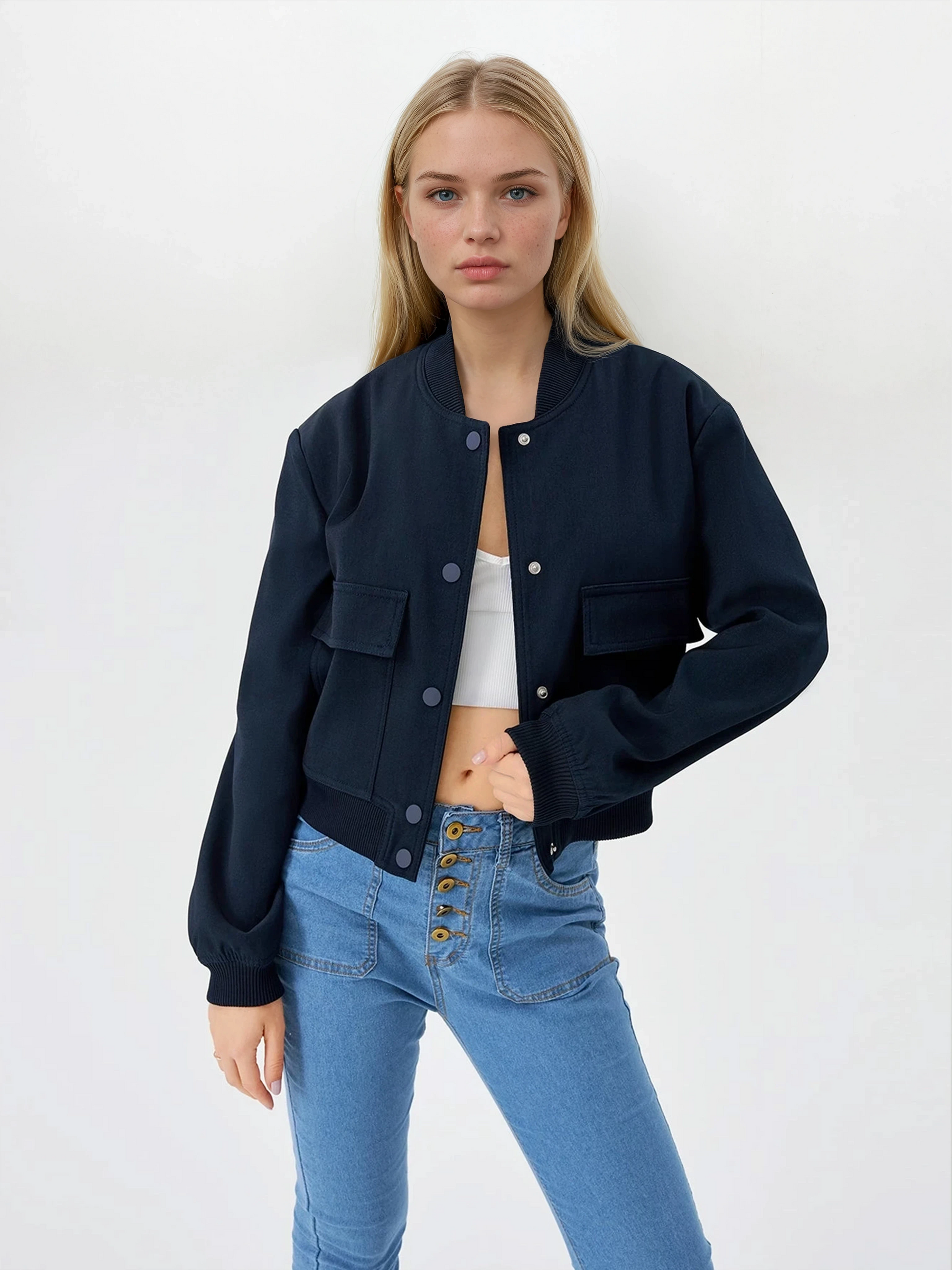 Design: Cropped bomber style jacket with snap button closure, stand up collar, flap pockets, and elastic hem and cuffs.