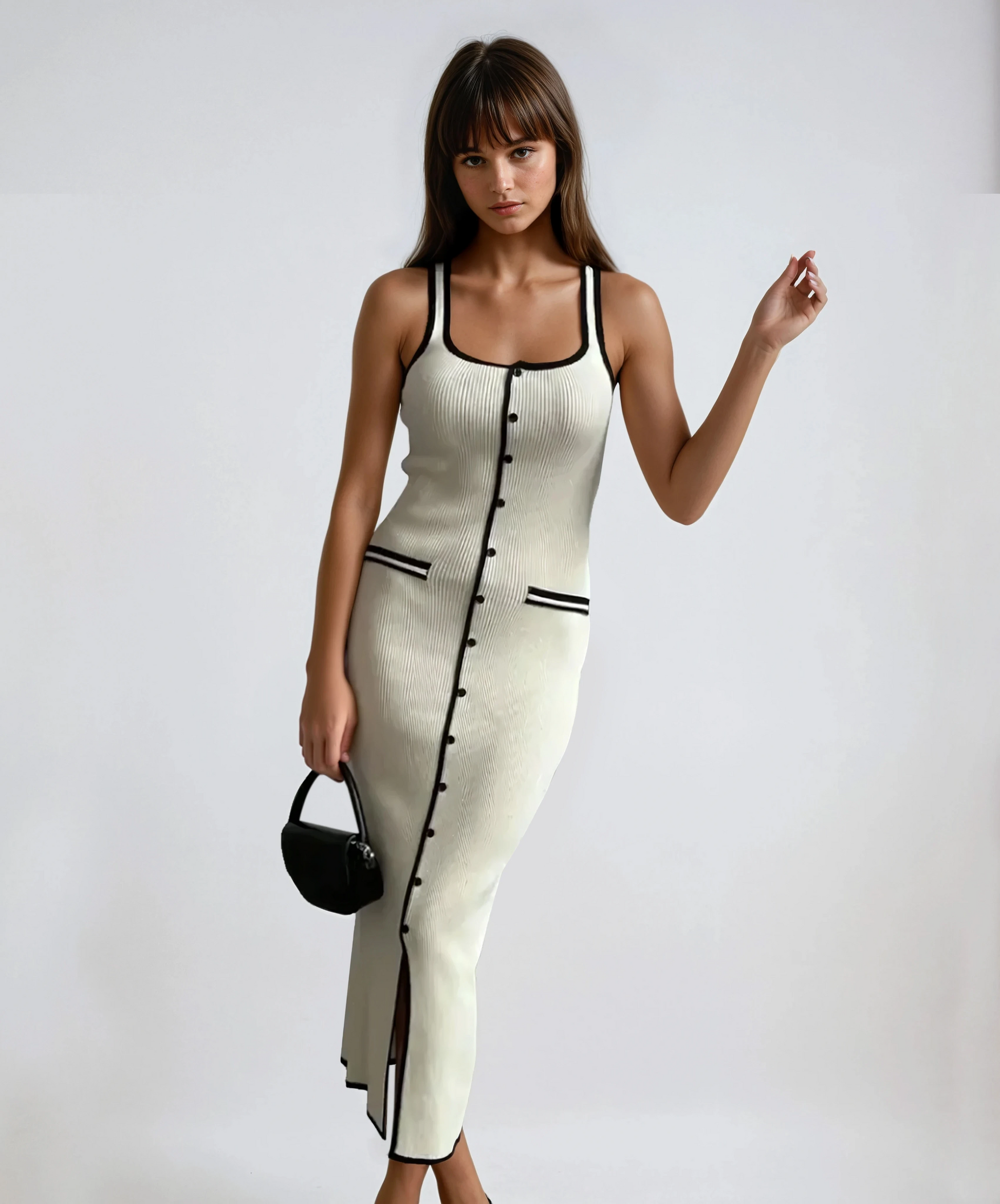 Design: A long vest style knitted dress featuring contrast color panels, multi buckle detailing, and a subtle slit for a modern, elegant look.